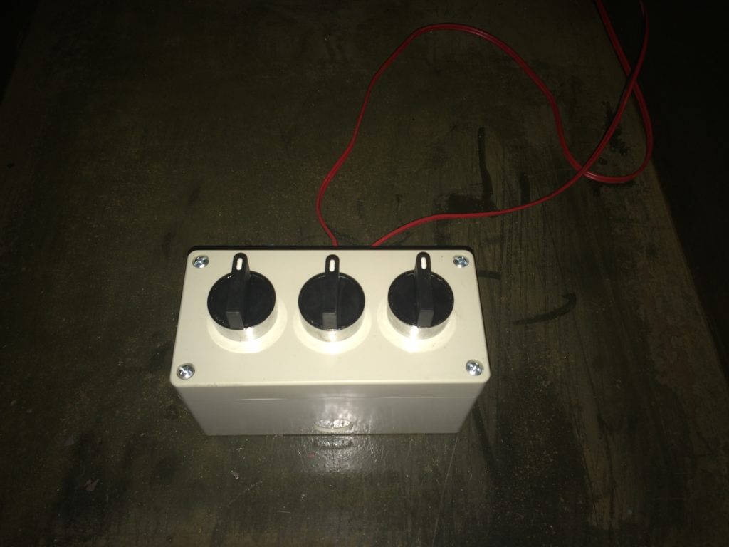 Easy game that just requires the user to set all 3, 3 position switches to the correct setting to activate a device. Works with any 12v device, such as our Diamond Box , magnetic lock box, solenoid lock box or our Gobo clue projector.